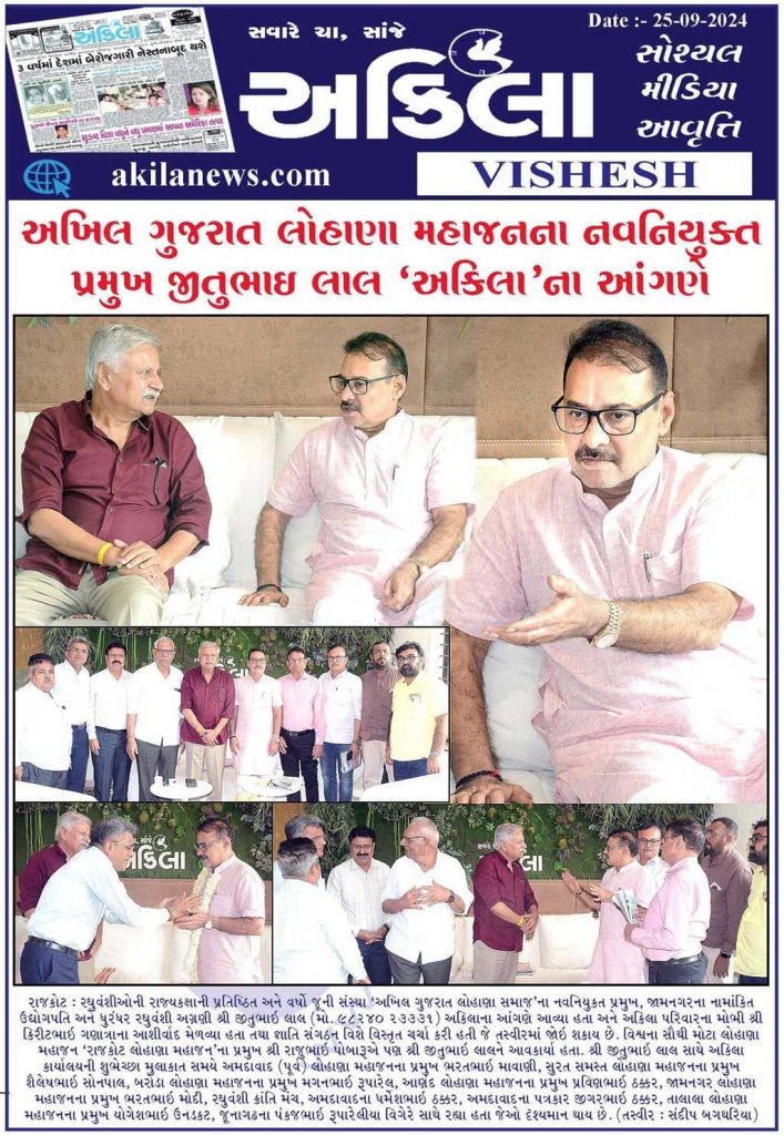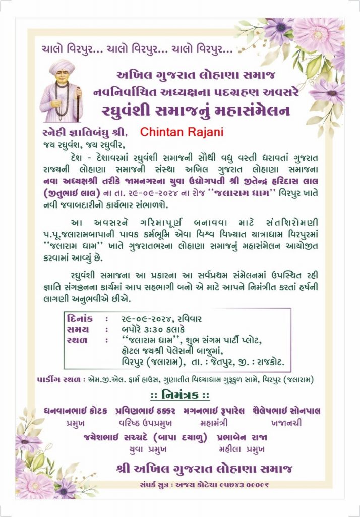 દેશ – દેશાવરમાં રઘુવંશી સમાજની સૌથી વધુ વસ્તી ધરાવતાં ગુજરાત રાજ્યની લોહાણા સમાજની સંસ્થા અખિલ ગુજરાત લોહાણા સમાજના નવા અધ્યક્ષશ્રી તરીકે જામનગરના યુવા ઉદ્યોગપતી શ્રી જીતેન્દ્ર હરિદાસ લાલ (જીતુભાઇ લાલ) ના તા. ૨૯-૦૯-૨૦૨૪ ના રોજ “જલારામ ધામ” વિરપુર ખાતે નવી જવાબદારીનો કાર્યભાર સંભાળશે.